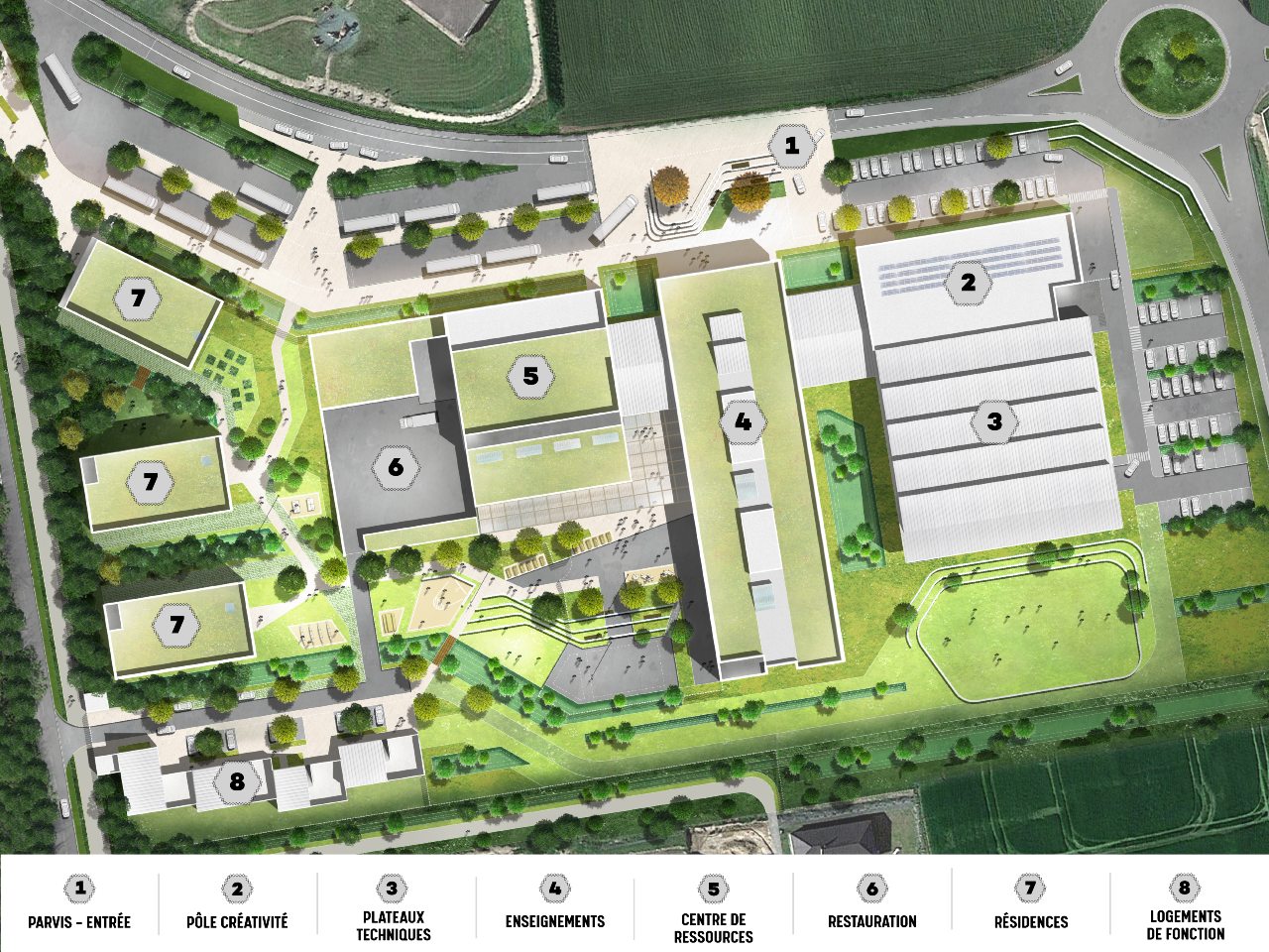 D’une surface de 18 500 m² répartie sur 5 bâtiments, le lycée disposera de 40 classes modulables, d’un centre de ressources, de 2 espaces d’expérimentation et de plusieurs espaces créatifs.