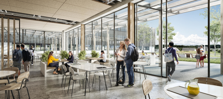 - Un parvis en lien avec la ville et ses équipements, s’ouvrant largement sur un hall/atrium partagé par tous les usagers du futur campus.