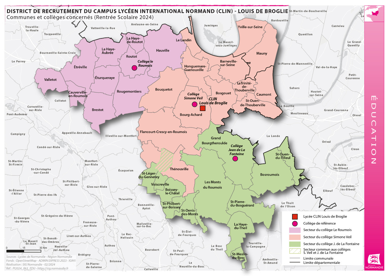 Depuis 2022, la Région Normandie a engagé la construction d’un tout nouveau lycée afin de répondre aux enjeux pédagogiques de demain tout en développant l’attractivité du territoire. Situé à Bourg-Achard, dans l’Eure, le Campus Lycéen International Normand (CLIN) - Louis de Broglie, sera en capacité d'accueillir jusqu’à 1 000 élèves de la classe de seconde à la terminale, 250 internes et 170 enseignants et personnels administratifs et techniques. La construction de ce lycée représente un investissement de plus de 62 millions d’euros pour la Région Normandie.