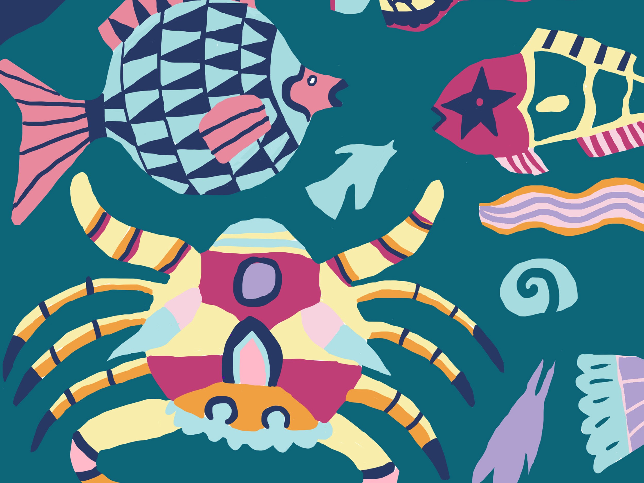 Au centre de l’exposition, une cabane de bois et de tissus imprimés ouvre grand ses portes. On s’y niche confortablement pour flâner, lire l’un des contes de la cour de récré imaginé par les enfants de l’école du Manoir ou l’un des nombreux livres mis à disposition. À la sortie du refuge, l’itinérance se poursuit dans des paysages oniriques réalisés par l’artiste et témoignant du caractère pluridisciplinaire de son travail. Plusieurs perspectives s’offrent aux visiteur·euses : une fresque murale plongeant le regard sous la mer à la rencontre de poissons et crustacés bigarrés, une invitation au jardin pour un tea time tout en céramique, ou la découverte d’une collection de médaillons et de masques fantastiques.