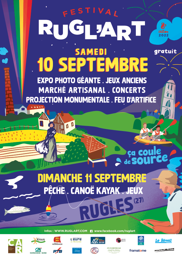 Le festival Rugl’Art c’est aussi une ambiance festive qui trouve son point d’orgue lors de la fête de clôture qui aura lieu les samedi 10 et dimanche 11 septembre 2022 à Rugles dans l’Eure. Le Festival Rugl’Art vous prépare un programme monumental pour cette 8e édition à Rugles dans l’Eure avec pour thème « Ça coule de source, l’histoire des 3 rivières ».