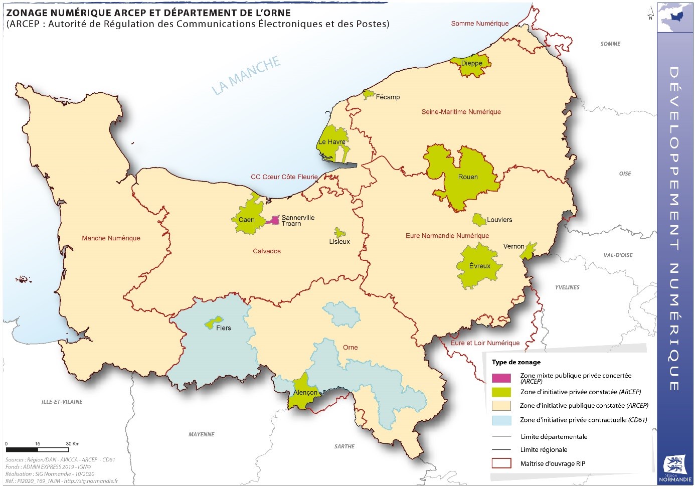Dans la zone d’initiative publique, les maîtres d’ouvrage sont les Départements dans le Calvados et dans l’Orne, et un syndicat mixte numérique dédié au numérique, un dans la Manche, un dans l’Eure et un en Seine-Maritime. La communauté de communes Cœur Côte Fleurie est maître d’ouvrage de son réseau, et certains syndicats hors région (Eure-et Loir numérique et Somme numérique) assurent également des opérations de déploiement du THD en Normandie, dans 3 communautés de communes (communautés de communes des Villes sœurs, Val d'Eure et Vesgre et du Val d'Avre).
