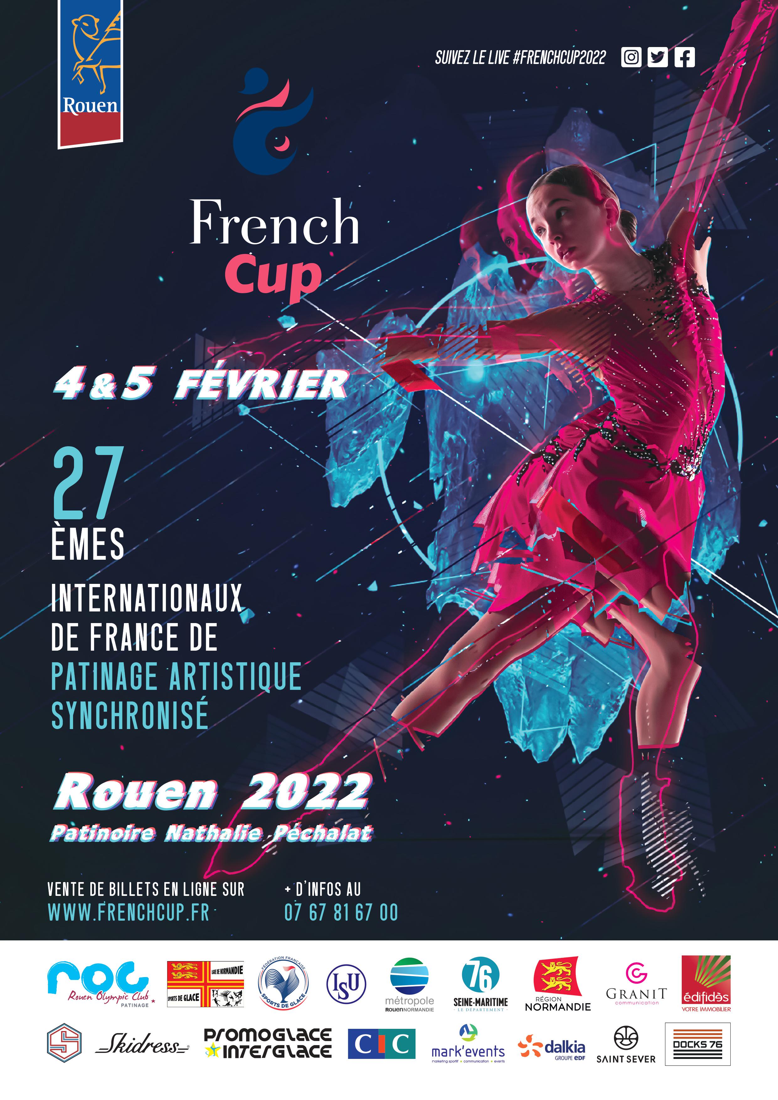 La French Cup revient pour une 27ème édition ces 4 et 5 février 2022. Malgré une organisation adaptée à cause de la situation sanitaire incertaine, la patinoire de Rouen accueillera, une nouvelle fois, de nombreuses équipes internationales durant ces 2 jours de compétition de patinage synchronisé. La French Cup, qualificative pour les mondiaux, aura l’honneur de se voir disputer une nouvelle discipline pour cette nouvelle édition : le Synchro Elite 12.