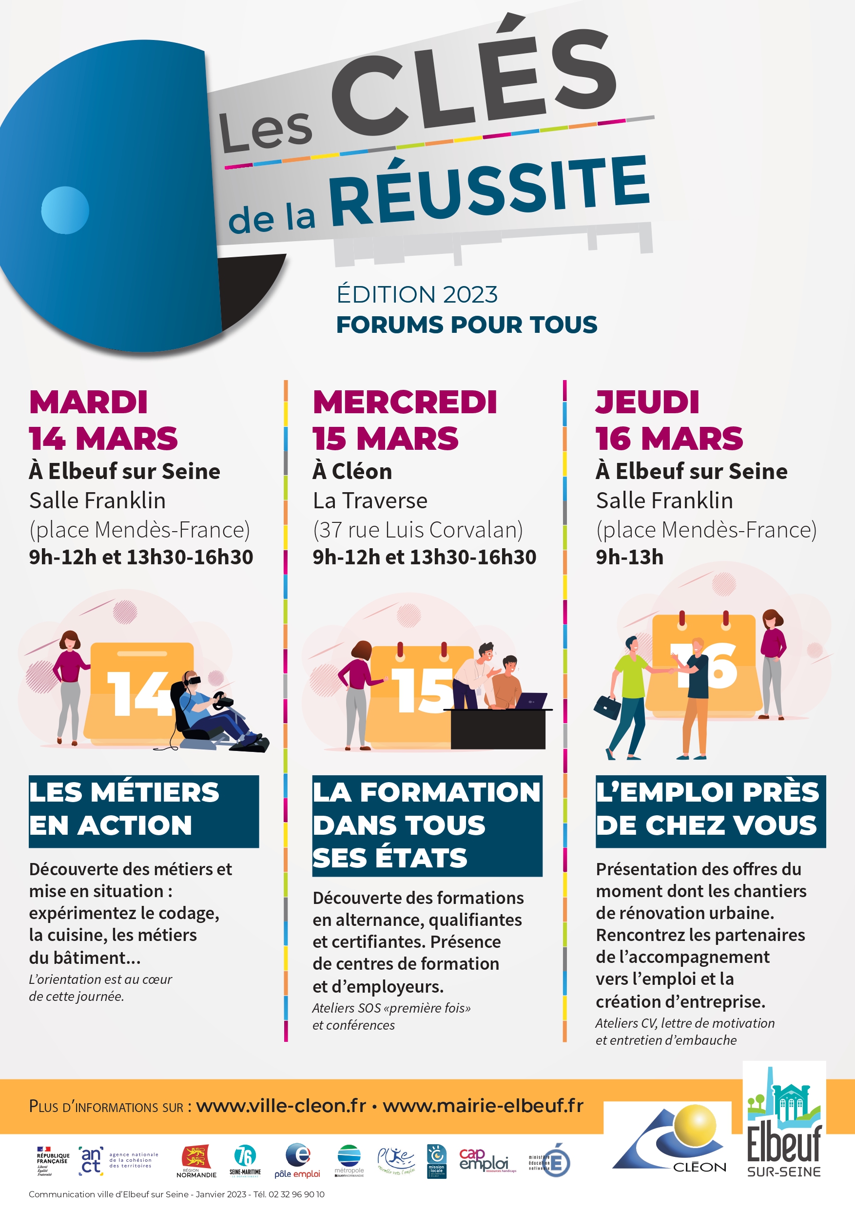 Depuis 2016, les villes d’Elbeuf sur Seine et de Cléon mutualisent leurs forces pour organiser Les Clés de la réussite et proposer ainsi aux habitants du territoire une offre complète quant à l’approche du monde du travail. Orientation, formation et accès à l’emploi sont au programme de cette 7e édition pour accompagner les scolaires, les jeunes, les demandeurs d’emploi, les salariés en reconversion professionnelle, et toute personne désireuse de créer son propre emploi.