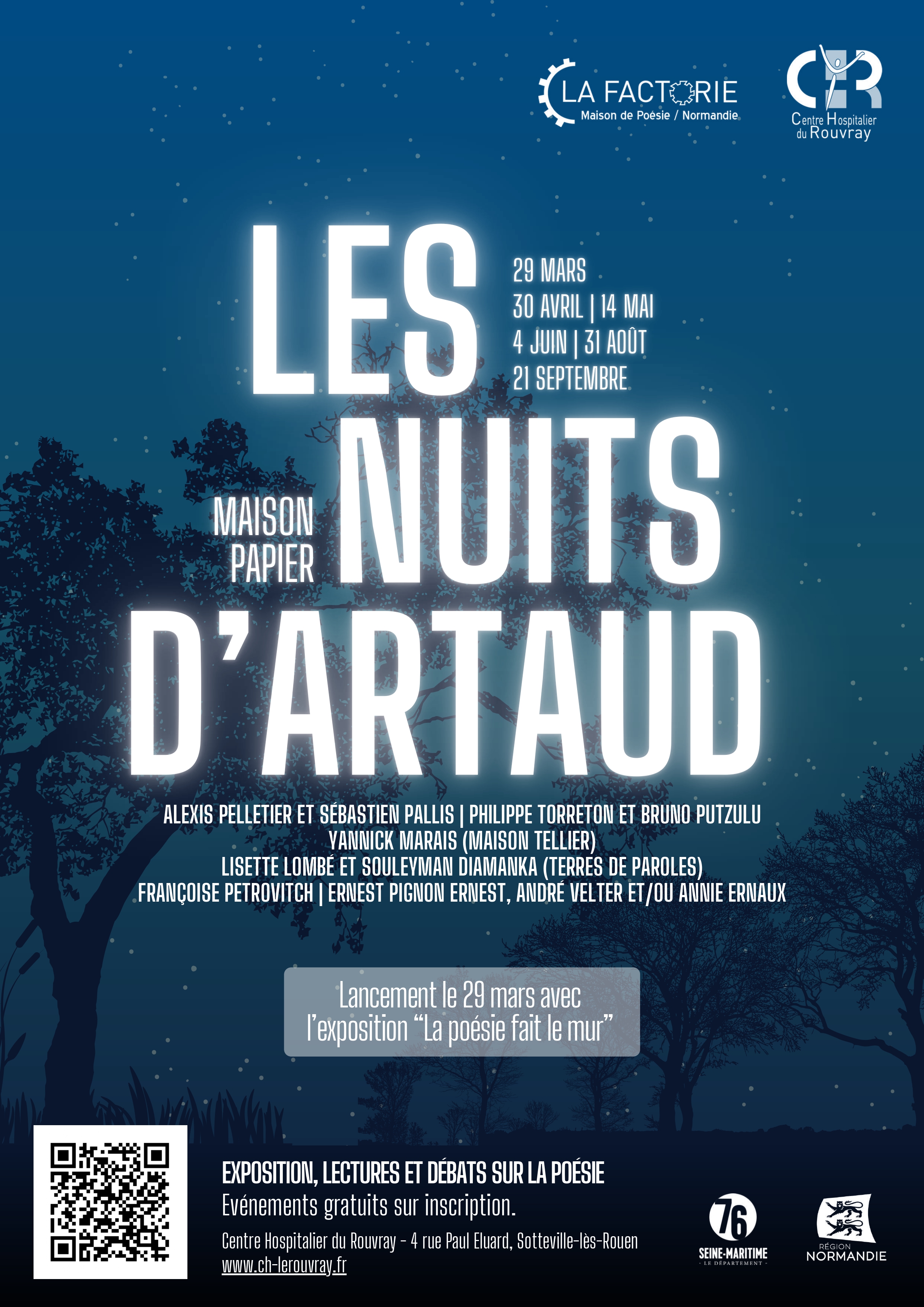 En écho à la présence d’Antonin Artaud hospitalisé au Rouvray de 1936 à 1937, chaque mois du printemps et de l’été, en lien avec la Maison de la poésie, le Centre Hospitalier du Rouvray organisera à la tombée de la nuit dans un lieu dédié, une soirée consacrée à la poésie.
